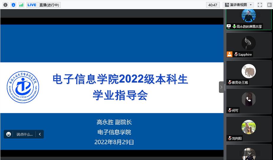 盛夏渐远,秋意愈浓,今年的开学季在绵绵的秋雨中开始,hg8868皇冠官方登录平台迎来了2022级280余名本科生。为了帮助新生更好地了解电子信息类专业的培养方案和课程体系,做好学业规划,8月29日下午,hg8868皇冠官方登录平台线上召开了2022级本科新生学业指导会。学院副院长高永胜、教务处王旭、学院2022级本科生辅导员翟伟乐和刘向阳、各班班主任、本科教学秘书何可参加了本次会议。会议由本科教学秘书杨瑾主持。