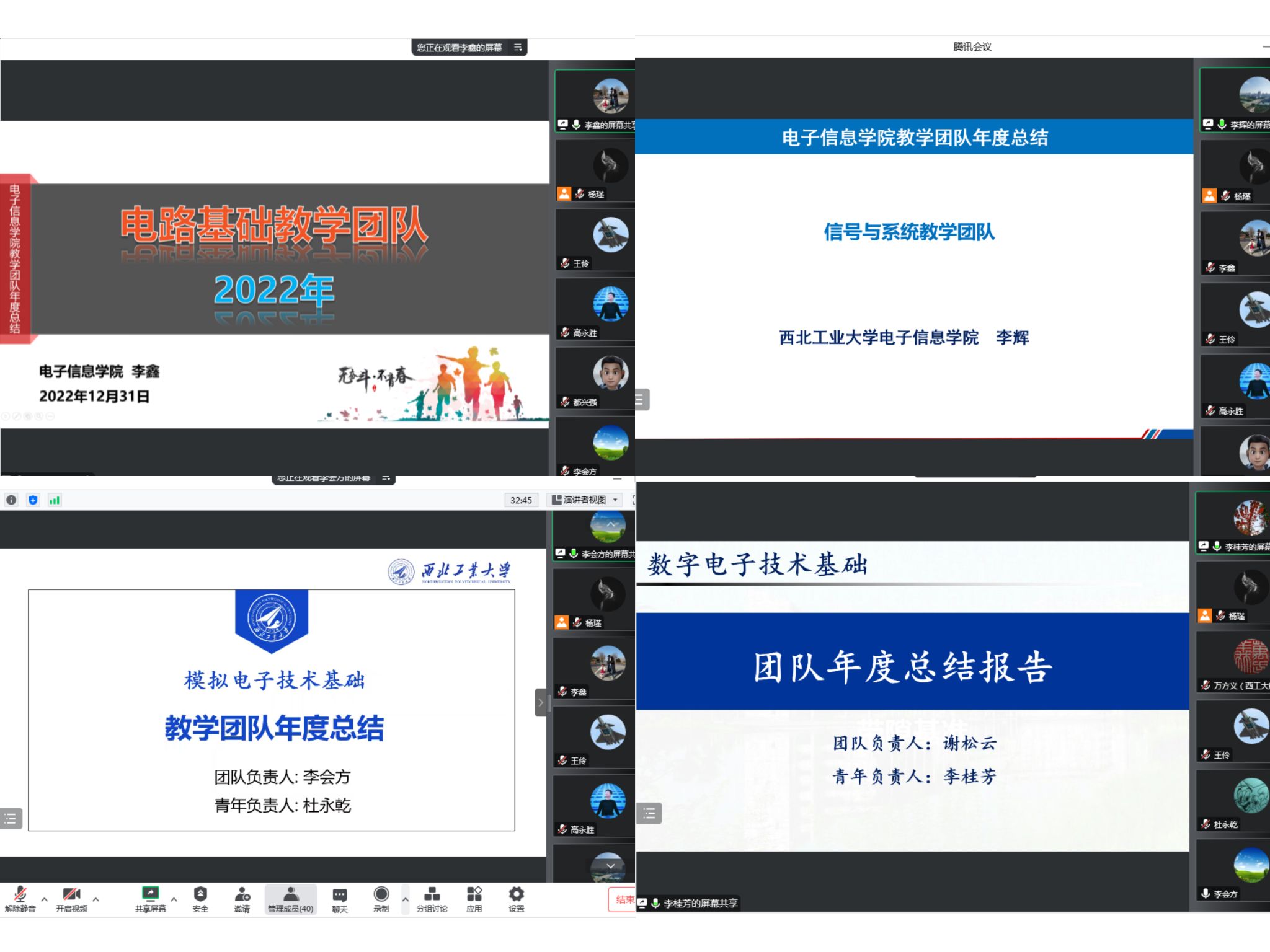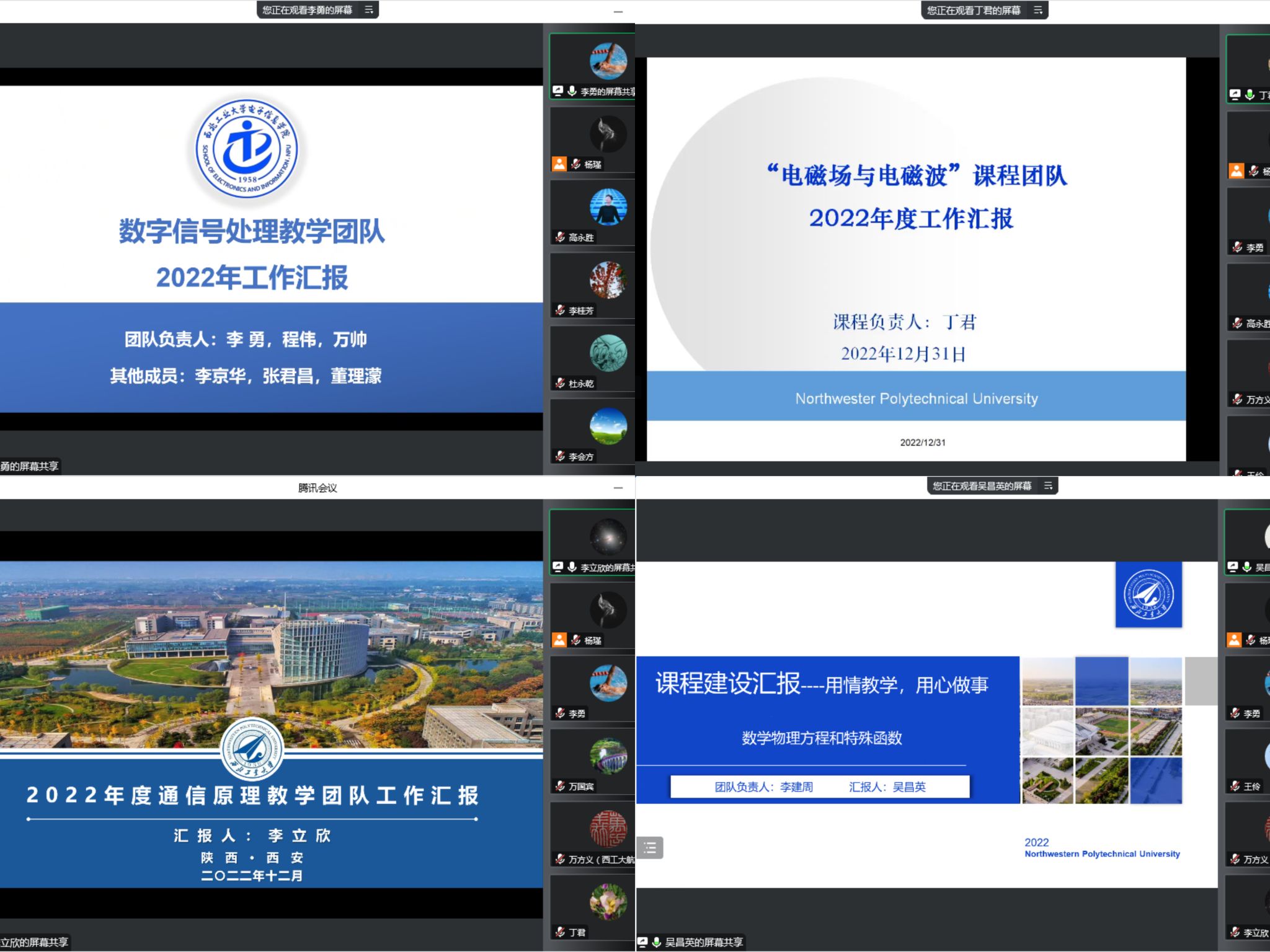 为认真学习贯彻党的二十大精神,落实学校一流本科人才培养行动计划,进一步推进基层教学组织建设,培养可持续发展的教师队伍,根据《hg8868皇冠官方登录平台教学团队建设与管理办法》文件精神,2022年12月31日,hg8868皇冠官方登录平台线上召开了首批8个本科教学团队年终考核评审会。评审会特邀材料学院副院长王永欣、航空学院副院长万方义、计算机学院副院长郭斌、hg8868皇冠官方登录平台院长王伶、副书记高敏、副院长姚如贵、张洵颖、高永胜及教师代表万国宾组成评审小组。各教学团队负责人、成员参加了本次评审会。