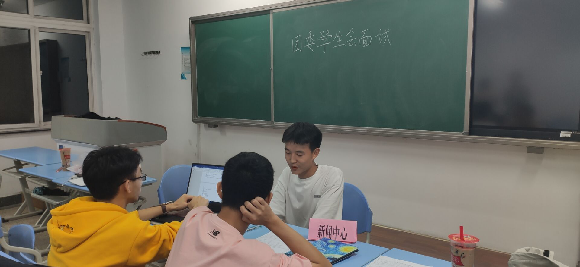 招新现场各个部门的面试活动如火如荼地进行中,主席团,部长团,大一新生齐聚一堂,每个部门都在积极进行面试工作。在新闻中心,部长团们先要求参加面试的同学进行一个简短的自我介绍,同时回答一些随机即兴问题。随后让他们对新闻中心下辖的‘技术组,新闻组,微信组’进行志愿排序。对于技术组感兴趣的同学,将会回答有关海报设计的问题,志愿微信组的同学将会被问及有关公众号文章排版问题。每个部门虽然形式各不相同,但是其目的都是为了互相熟悉了解彼此,今后大家能够一起学习,一起进步。随着9月21日各个部门面试通过短信的顺利送达,本次面试活动顺利结束!