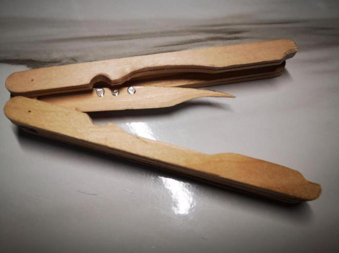 本作品灵感来源于漫威金刚狼,作品以木棒为主要材料,同时,使用少量塑料片及橡皮筋制作触发装置和动力装置。不同于电影设定,此爪为简易的机械外骨骼,通过爪子上的小楔形块和挡板将三根爪子固定在刀鞘中,使用时,拉动绳子,控制塑料片带动挡板脱离楔形块,使三根爪子从刀鞘中弹出,使用完毕后可将爪子重新收回刀鞘并固定。本作品的特色在于在用材极简的同时,保证了此爪的基本性能,可满足平时的娱乐需求,具有很好的观赏性及科技性。
