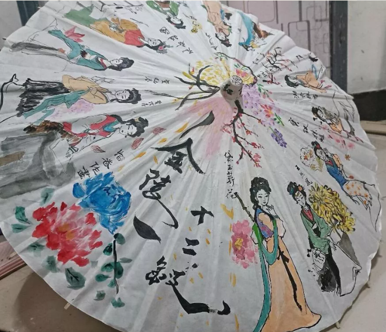 我们根据红楼梦的故事内容,结合书法艺术,绘制了黛玉葬花、宝钗扑蝶、湘云眠芍等经典场景,人物在构图中的安排分组就像电影的一组组镜头循序映出,摒弃了“焦点”透视的绘画概念,不但打破了时间、空间的限制,而且离开了自然景的特定位置,只有形象的主次统一画面。每个人的身边是她们自己的意象花,伞中心是四季的代表花,向外延展开来,伞柄上绘制花枝,花枝上的伞面定格了十二位姑娘如“花”般的美,也就是花冠,红楼则是花蕊。我们伴随着红楼梦的主题曲作画,将心中的感情投注在了绘画过程中。这把伞不仅浸透了我们对红楼的爱意。同时,我们一起制作,收获了快乐,这把伞也承载着我们之间的感情。