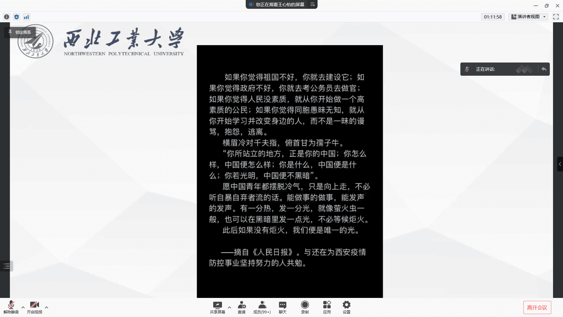 第三部分,王心怡介绍了学校最新的防疫工作安排:要求每位按照学校的要求去做核酸检测,不得与校外人员接触;鼓励同学积极参加志愿活动,为抗疫工作出一份力;外出购餐时需按规定进行,购完餐食及时返回宿舍不得在外逗留;保持宿舍卫生干净,注意通风,禁止使用大功率电器。