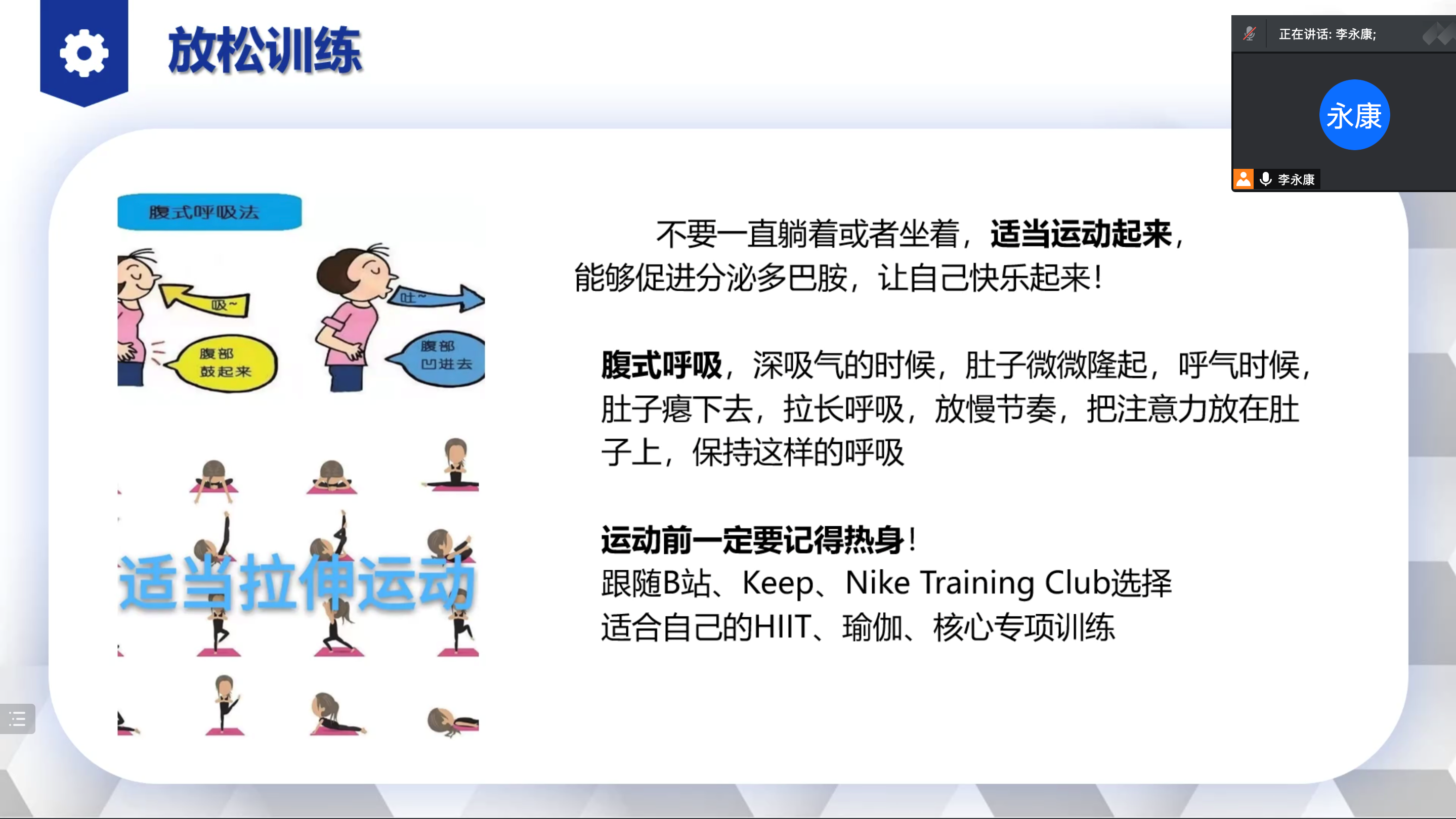 首先,李永康老师从心理学角度解释隔离期间会出现的“焦虑、烦躁、抱怨”等情绪产生的原因和缓解方法,希望同学们能够保持良好的心态,养成规律的作息,做适当的运动。