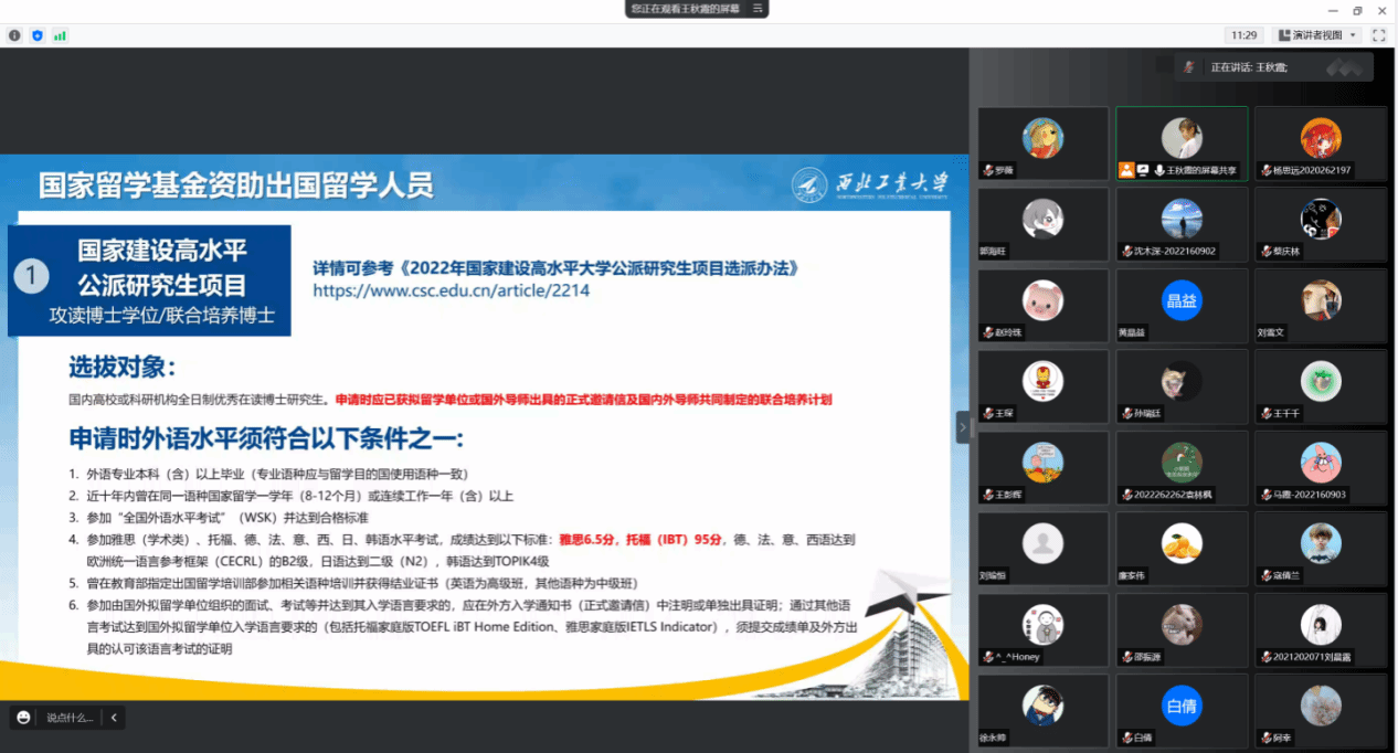 为帮助学生进一步了解赴国(境)外交流的相关政策,提升学生国际视野,2022年9月20日晚上8点,hg8868皇冠官方登录平台召开研究生赴国(境)外交流项目线上宣讲会,学院国际化秘书王秋霞老师详细介绍了研究生赴国(境)外交流的相关项目政策及流程办理,学院硕博各年级近百名学生线上参会。