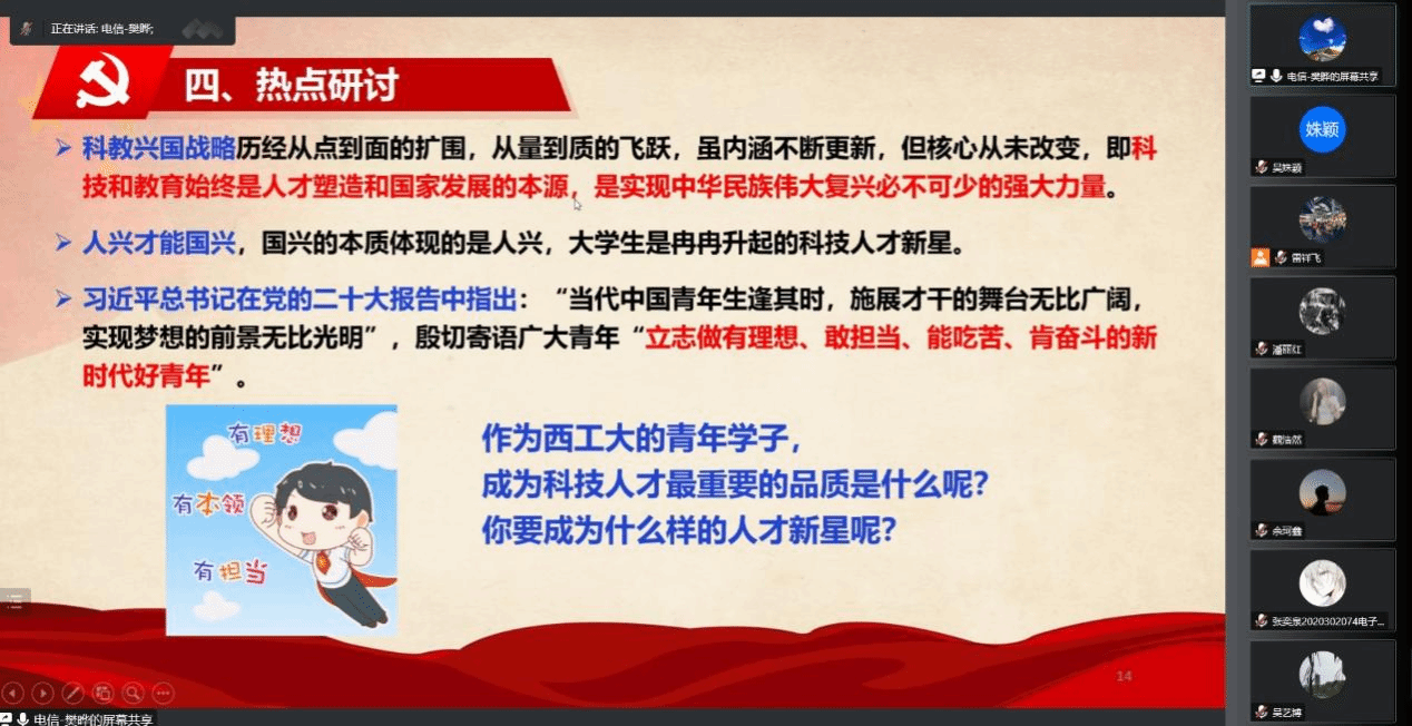 针对分享的三个主题,三位领学的同志凝练出了相关的讨论问题,以问题带动思考,与会党员在会上交流感想与收获。