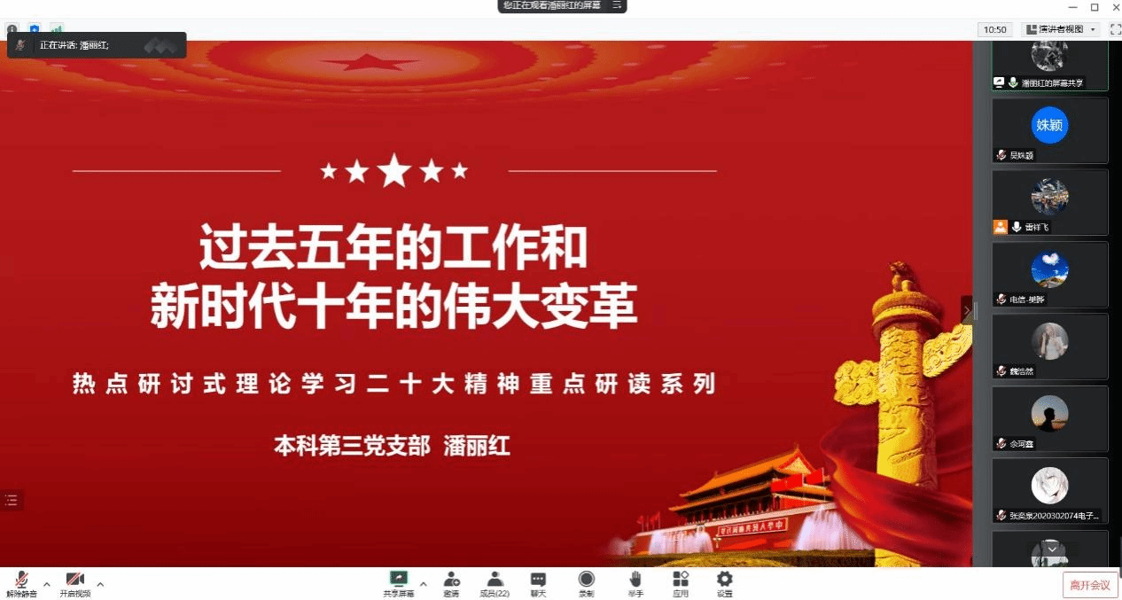 支部党员潘丽红同志结合党的二十大报告,带领与会党员一同学习。她讲到,习近平总书记在党的二十大报告中回顾了过去五年的主要工作,总结了新时代十年的伟大变革。新时代十年的伟大变革离不开十年前改革开放和社会主义现代化建设取得的巨大成就。潘丽红同志分享了视频《百秒说·非凡十年》,用一百秒的时间,高度概括总结了新时代十年在各个方面的伟大成就,同学们纷纷感受到中国速度、中国成就正在惊艳世界。
