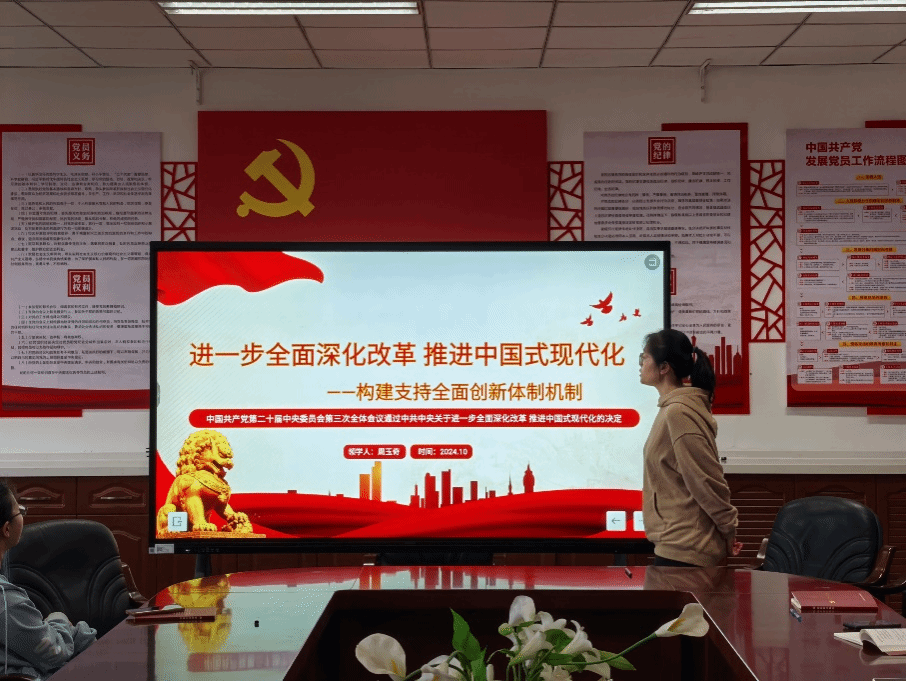 周玉奇同志以“构建支持全面创新体制机制”为主题带领支部党员学习。她讲到,党的二十届三中全会提出,教育、科技、人才是中国式现代化的基础性、战略性支撑。必须深入实施科教兴国战略、人才强国战略、创新驱动发展战略,统筹推进教育科技人才体制机制一体改革,健全新型举国体制,提升国家创新体系整体效能。随后,她回顾了党的二十大报告中对教育、科技、人才的统筹部署,结合自身本科学习、推免经历和我校教育教学、科技创新相关措施和成果,详细介绍了党的二十届三中全会提出的教育体系、科技体制、人才发展机制三方面的改革举措。同志们也感受到了教育体制、科技创新和人才发展对现代化建设的重要意义。