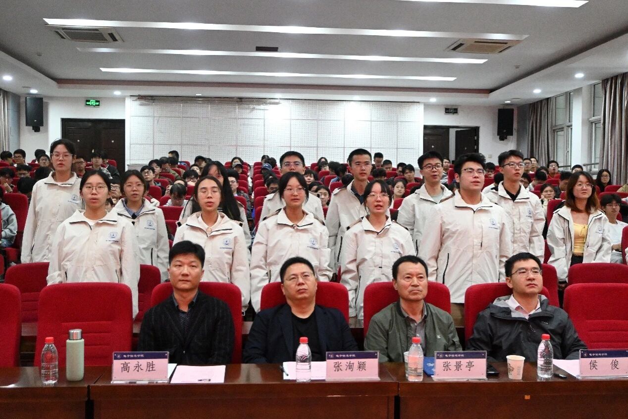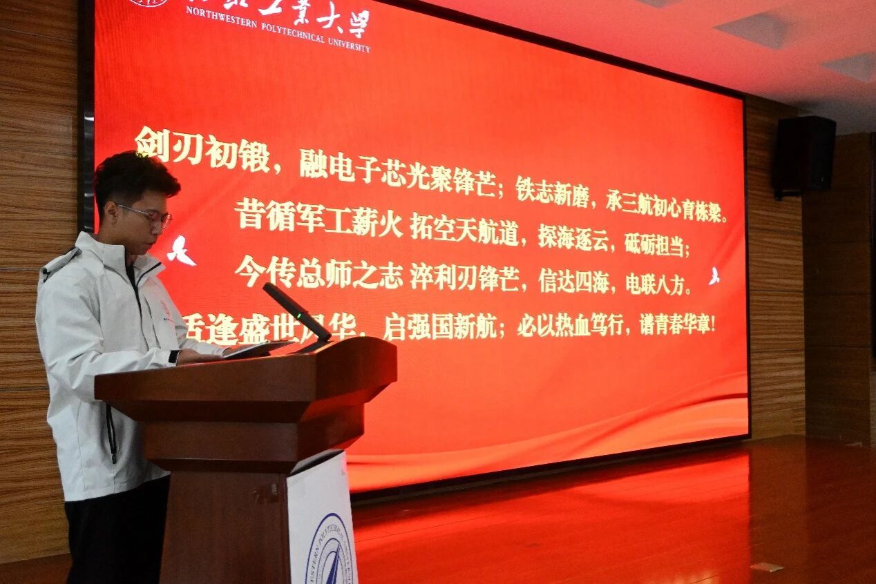 铸剑班学生代表、2024级本科生胡珂上台发言,分享了加入铸剑班的初心与期待,并带领全体成员庄严宣誓:“剑刃初锻,融电子芯光聚锋芒;铁志新磨,承三航初心育栋梁……”铿锵的誓言回荡在报告厅内,彰显着新一代西工大学子的担当。