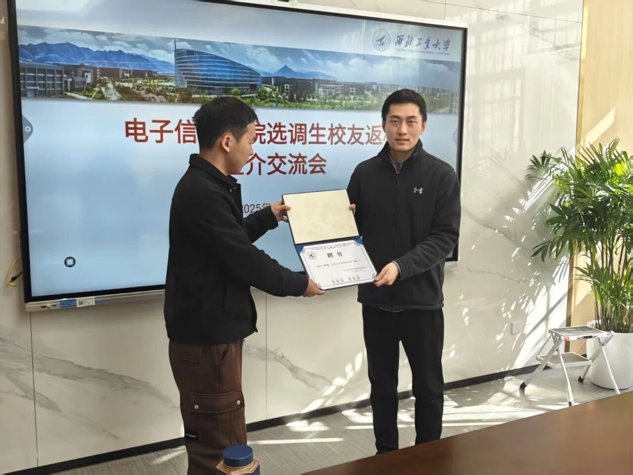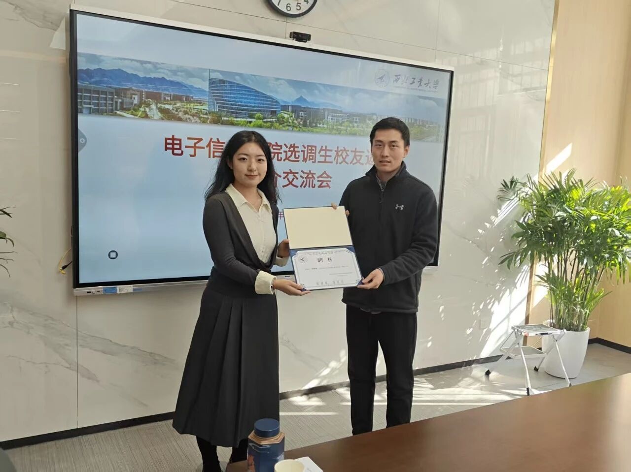 活动伊始,史越介绍参会人员,代表学校聘任何明遥、何飞龙为我校校外职场导师,并赠送纪念品。在随后的校友发言中,何明遥以扎根北疆沃土,践行工大精神为题从三个方面与大家进行交流分享,从母校理论课程的系统学习、工程实践的深入参与,到科技一线,掌握各级科技政策,持续提升创新意识和业务工作能力,再到扎根基层乡镇,走向广袤田野,和村干部一同入户,讲政策、听意见、找办法、解难题。她始终铭记母校“公诚勇毅,三实一新”的校训,勇担责任、砥砺前行,向下扎根、向上生长,用奋斗诠释初心,努力交出一份属于西工大人的时代答卷。何飞龙则从具体选调生问题出发,以自身见闻出发,更加具体地回答同学们所遇到的问题。
