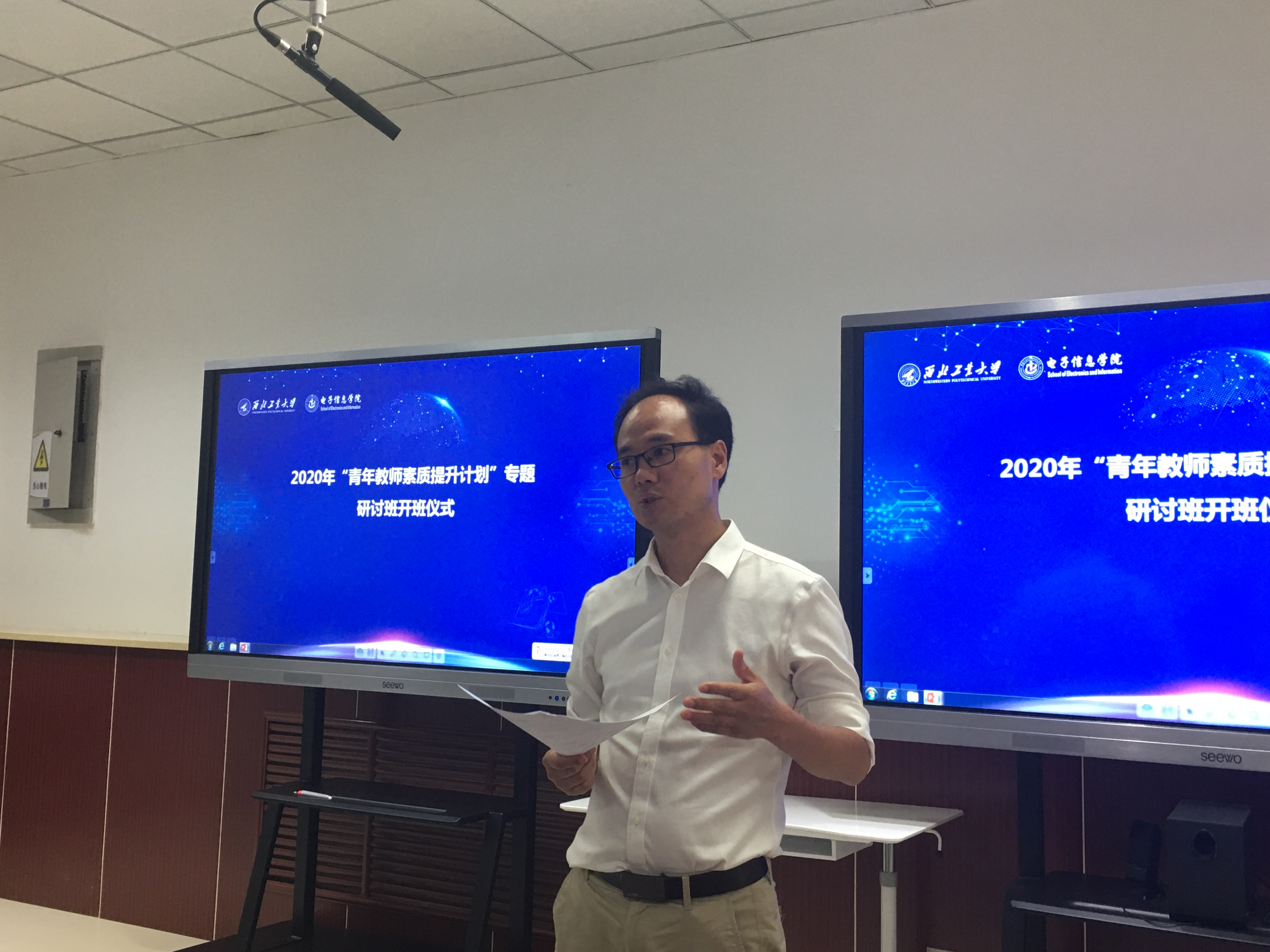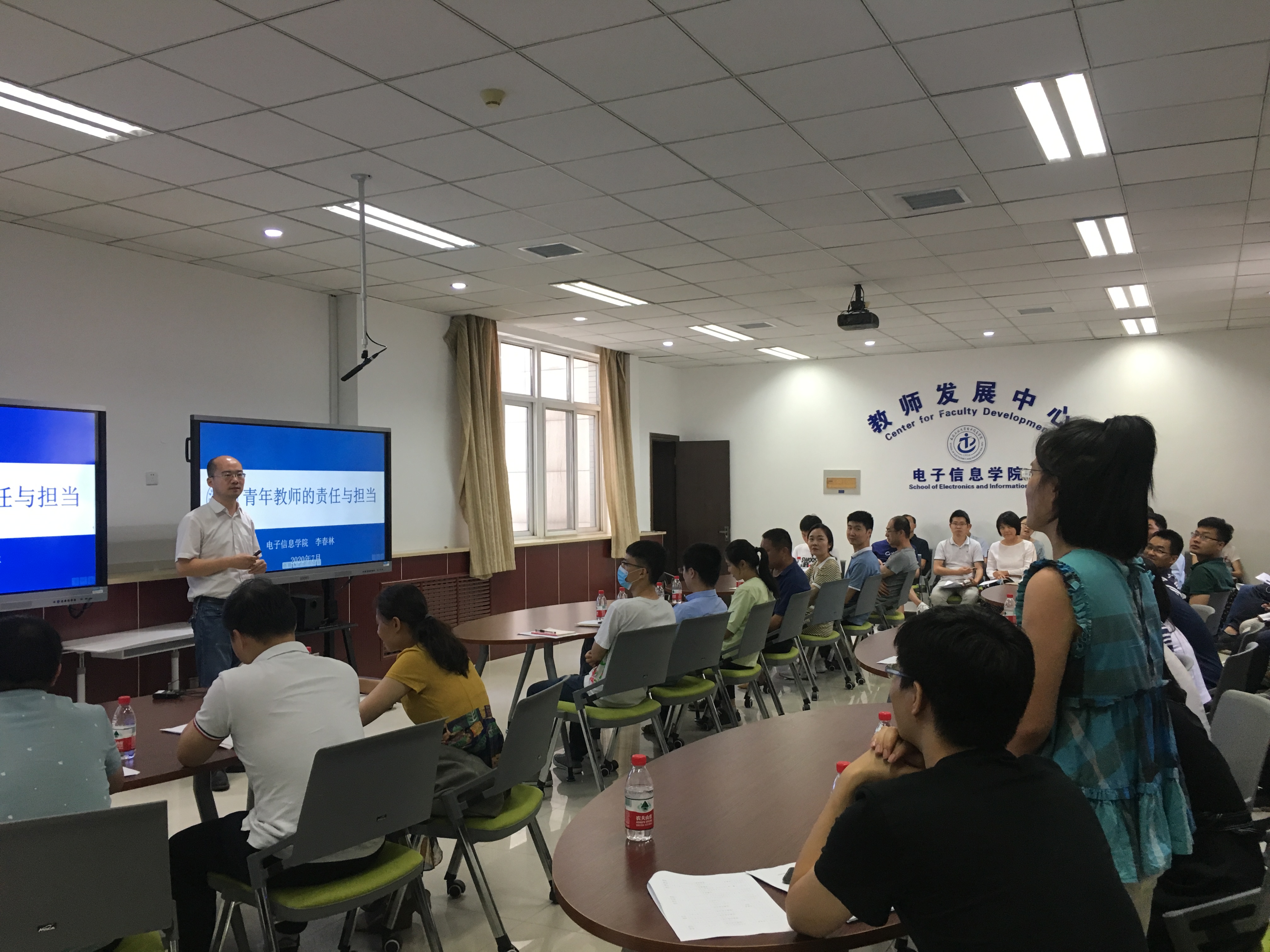为深入贯彻党的十九大精神,贯彻落实学校十三次党代会精神,加快一流学院和一流学科建设,进一步加强hg8868皇冠官方登录平台和微电子学院教师队伍建设,提高新聘青年教师的思想政治素养、教育教学能力和学术研究水平,7月7日下午,hg8868皇冠官方登录平台党委举办的2020年“青年教师素质提升计划”专题研讨班在学院教师发展中心275室开班。hg8868皇冠官方登录平台和微电子学院新入职青年教师共60人参加了本次培训,hg8868皇冠官方登录平台党委书记李春林,副院长(主持工作)王伶,副院长冯晓毅,副书记彭亮,工会主席、院长助理包涛出席开班仪式,学院党委副书记彭蓉主持开班仪式。