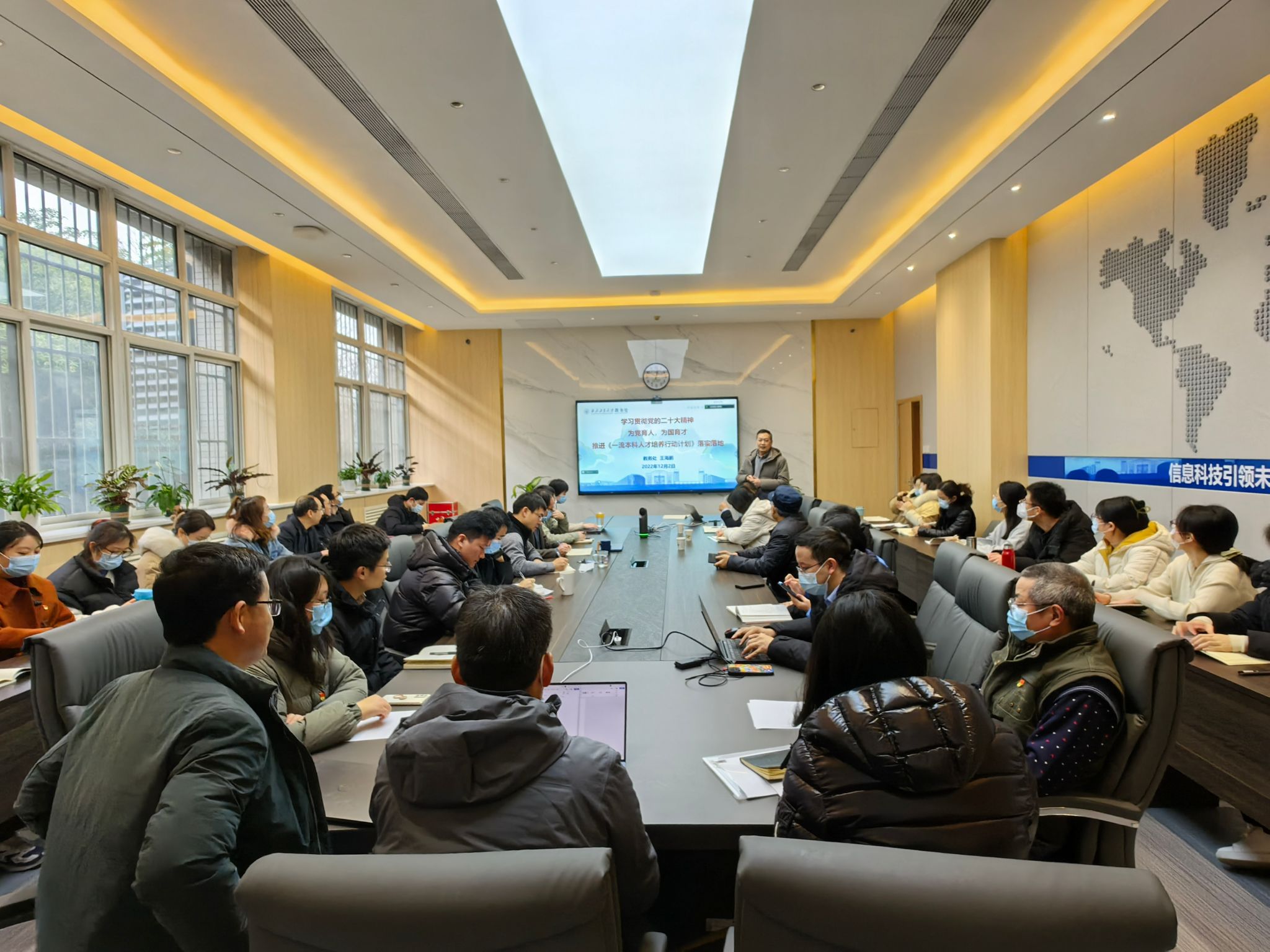 2022年12月2日,hg8868皇冠官方登录平台特邀学校党的二十大宣讲团成员、教务处处长王海鹏到学院进行党的二十大精神宣讲。本次宣讲活动在学院楼119会议室举行,由学院党委书记侯俊主持。院长王伶、党委副书记高敏、副院长姚如贵、张洵颖、高永胜以及各教师支部委员、学院办公室人员、非党员青年教师参加了宣讲会。会议通过“线上+线下”相结合的形式开展。