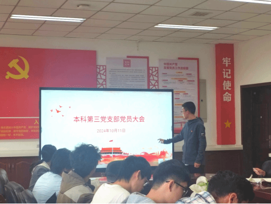 2024年10月11日,本科第三党支部召开党员大会,组织全体党员深入学习宣传中国共产党我校第十四次代表大会的报告,旨在深刻领悟会议精神,统一思想,明确方向,为推动支部的高质量发展贡献力量。本次党员大会由支部书记吴艺博主持,支部全体党员参加。