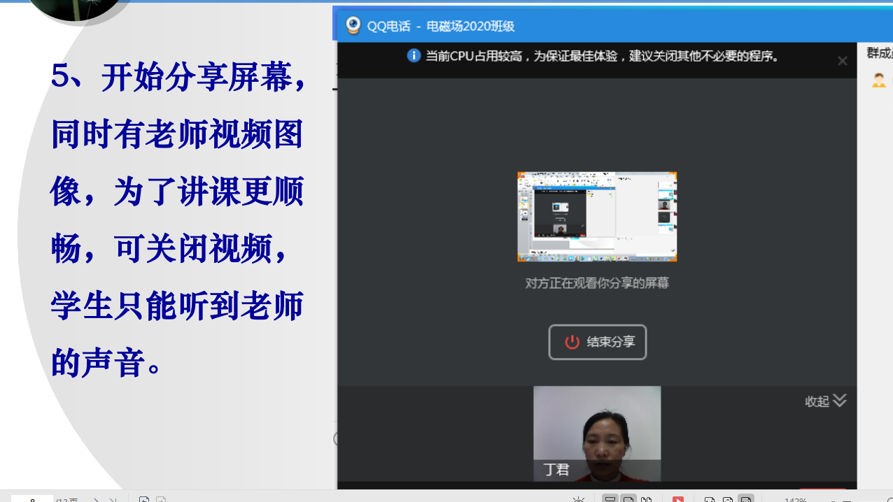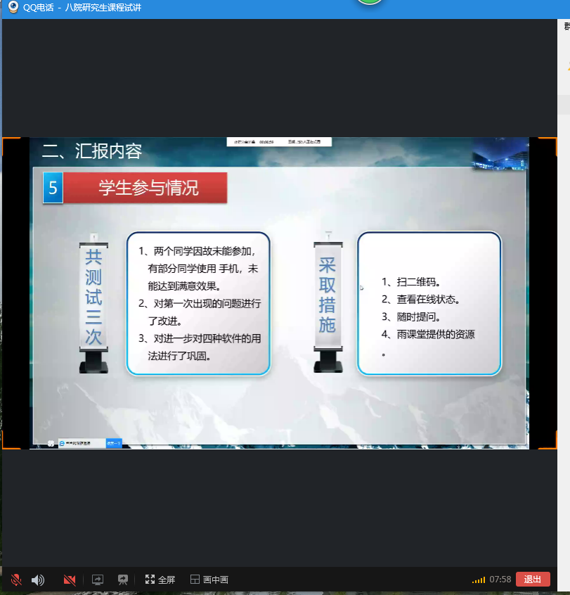 为保证在线课程教学质量,学院成立了在线教学督导组,根据课程开设实际情况分配督导任务,每门专业课都配有一名督导老师和教学主任同时进行督查,实现对学院开设课程全覆盖,学院教学督导组与学校在线督导组形成联动机制。本学期全体专业课任课教师根据线上教学要求,建立了班级授课QQ群,在各课程平台上完成建课和教学资料上传工作,任课教师积极主动参加学校各项平台操作培训、旁听研究生院组织的公共课试讲以及在线教学交流会,大家互帮互助,群策群力,不断丰富线上教学手段。特别是丁君教授还自己总结出一套QQ教学方法,做成PPT后分享给全院老师,受到广泛好评。线上课程教学安排准备也非常充分,得到学院督导肯定。《多媒体信息处理》课程主讲教师李会方教授,在正式开课前与学生认真进行了多次测试,准备了4套不同平台授课方案,精挑细选了各类丰富课辅资料供学生在线学习。《多核处理器架构与高速信号处理》主讲教师吕国云副教授,针对课程内容对各阶段学时做了精细划分,细致梳理了各章节重点及学习要求,准备了多种互动教学方式,试讲时流畅通顺、一气呵成。充分的线上教学准备,有力保障了课程教学工作的顺利开展。