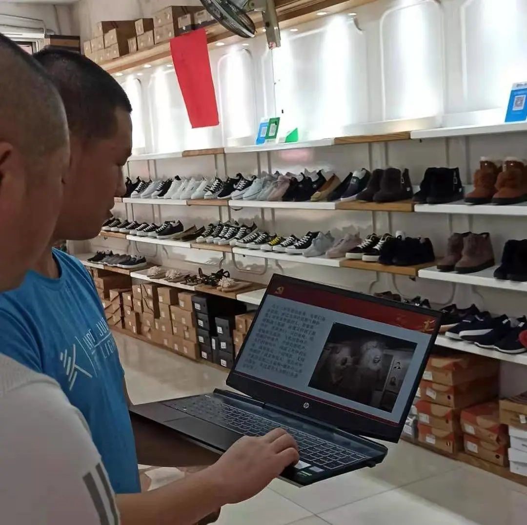 蔡旭东同学选择在附近街区,向一些店家进行宣传工作,这是一张蔡旭东向一家鞋店的店家进行宣传的画面。