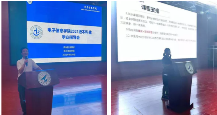 丹桂飘香,秋风送爽,hg8868皇冠官方登录平台迎来了2021级280余名本科生。为帮助新生了解电子信息类专业的培养方案和课程体系,指导同学们更加科学合理规划自己的大学生涯,2021年8月30日,也是正式开学第一天,hg8868皇冠官方登录平台在教学西楼D100召开新生学业指导宣讲会。hg8868皇冠官方登录平台副院长高永胜副教授、院长助理王丽、校教务处仇梦一、学院教务秘书宫予涵以及各班班主任参加了此次宣讲会,会议由2021级本科生辅导员吴宝龙副教授主持。