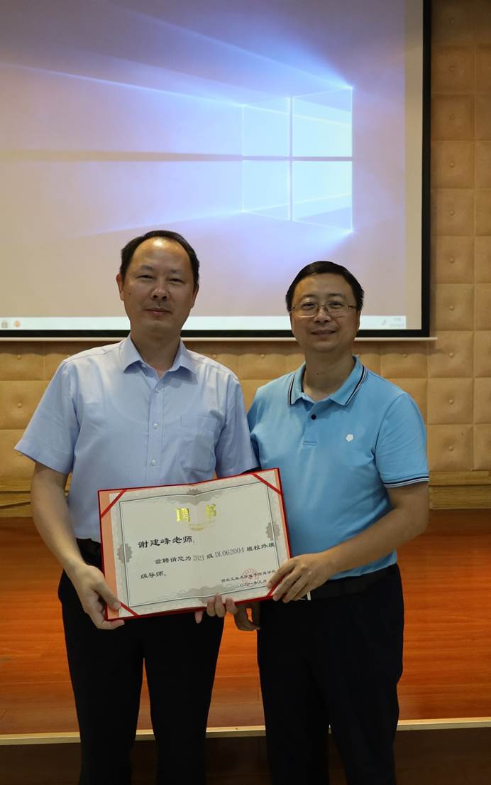 会议伊始举行了hg8868皇冠官方登录平台2020级4班校外班级导师聘任仪式。彭亮为谢建峰总经理颁发聘书。
