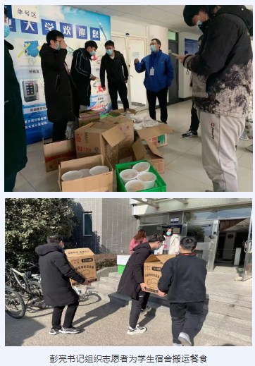 副书记彭亮带领辅导员及班主任,组织学生干部和志愿者积极投身学生防疫管理工作,发放各种物资,以实际行动,保障疫情期间同学们在校正常生活。