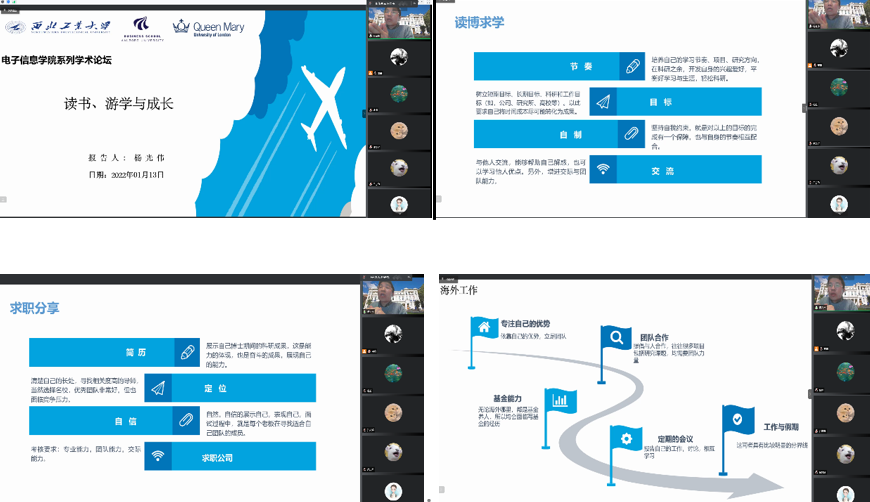 杨光伟从读博求学、求职分享、海外工作、人文风景等四个方面,给大家分享了自己在读博求学和出国留学过程中的经历和感悟。他建议在科研路上不要仅着眼于自己手头的工作,也要注意培养沟通交流能力,多与他人交流能够帮助自己解惑,也可以学习他人优点,更能发挥团队优势,增进团队凝聚力。