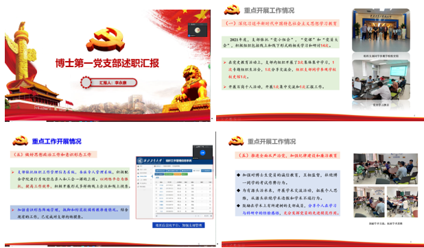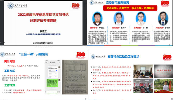 hg8868皇冠官方登录平台党委副书记彭亮介绍本次考核工作的考核内容和评分标准。本次考核覆盖20个学生党支部,包括5个本科生支部、11个硕士支部和4个博士支部,考核方式采用5分钟PPT线上汇报加3分钟专家点评及提问的方式进行。述职内容包含支部基本情况、支委作用发挥、“三会一课”开展情况、党员发展工作、党史学习教育情况、“百岗千人”活动开展情况、我为群众办实事、支部特色活动及工作亮点、存在的问题和下一步工作计划等。支部书记考核总分由两部分组成,一是根据答辩和述职报告情况专家打分(占总分的90%),二是根据党支部“三会一课”检查情况进行打分(占总分的10%)。