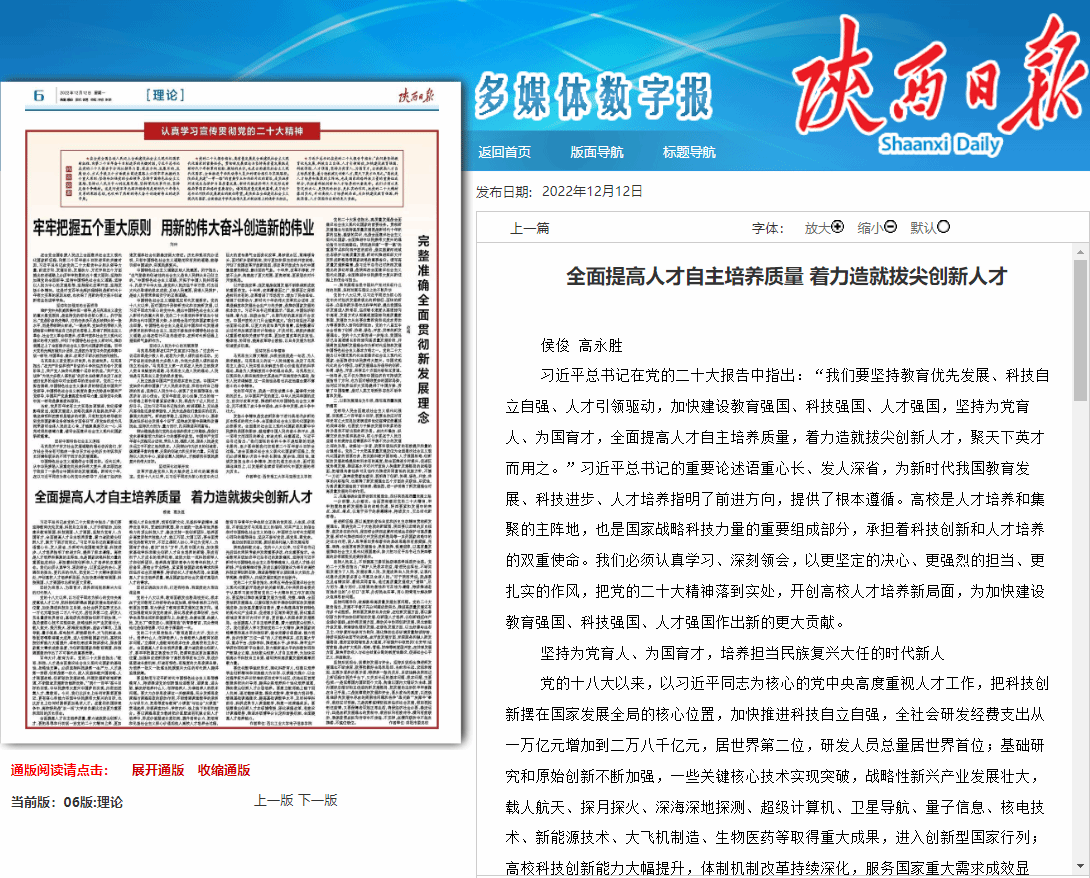 12月12日,《陕西日报》理论版“认真学习宣传贯彻党的二十大精神”专栏,刊登hg8868皇冠官方登录平台侯俊、高永胜署名的理论文章:“全面提高人才自主培养质量 着力造就拔尖创新人才”。