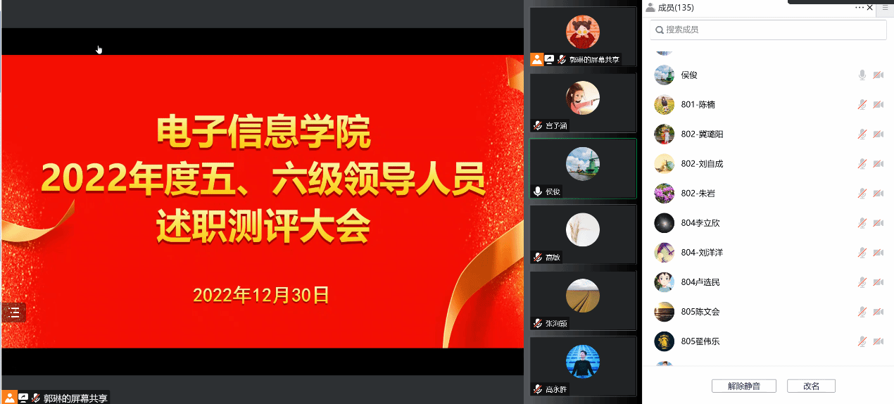 12月30日,hg8868皇冠官方登录平台召开2022年度五、六级领导人员述职测评大会,会议以线上方式进行。电子信息学院领导班子、教师代表和学生代表共一百四十余人参加了测评会。会议由学院党委书记侯俊主持。