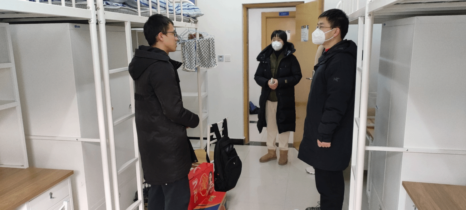 爆竹声声一岁除,春风送暖入屠苏。1月21日(除夕)上午,hg8868皇冠官方登录平台党委书记侯俊、副书记高敏代表hg8868皇冠官方登录平台,到海天苑1C和星天苑E座逐个走访并慰问了春节期间学院的留校学生,详细询问了每位同学的春节准备情况、近期的学习生活安排、当前的住宿和就餐等事宜,叮嘱同学们要关心关爱父母、与家人多联系、在学校度过一个有意义的春节,同时送上了学院精心准备的新春大礼包。同学们对学院领导的关心关怀表达了谢意,对学校寒假期间的住宿饮食保障也表示了感谢,同时表示将珍惜学校提供的良好环境认真完成学业。辅导员吴宝龙、刘向阳也参加了慰问活动。