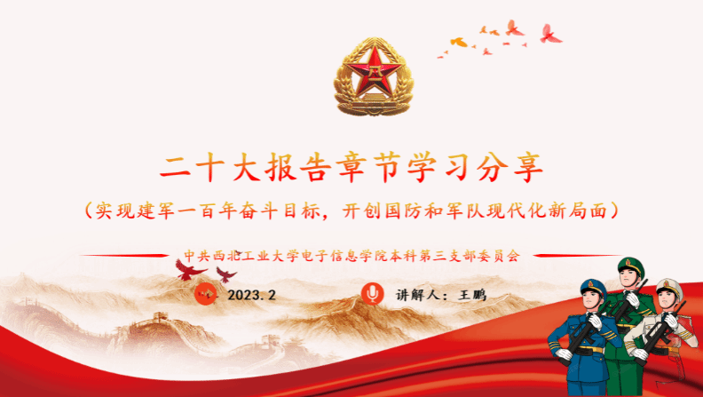 王鹏同志从“全面加强人民军队党的建设,确保枪杆子永远听党指挥”、“全面加强练兵备战,提高人民军队打赢能力”、“全面加强军事治理,巩固拓展国防和军队改革成果,完善军事力量结构编成,体系优化军事政策制度”、“巩固提高一体化国家战略体系和能力”四个方面进行了领学,通过一系列的权威报告回顾了中国共产党在建军一百年奋斗目标以及国防和军队现代化建设方面所做的努力。