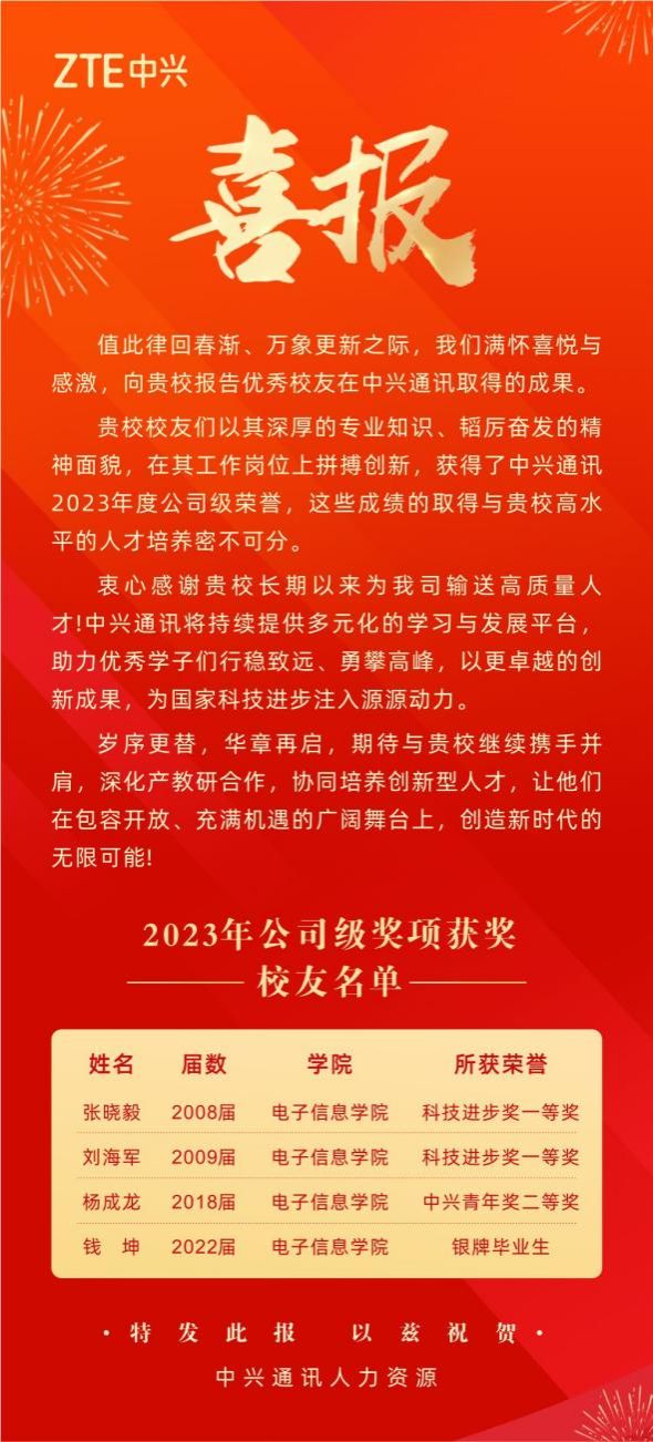 近日,中兴通讯向我校发来喜报,共有16名校友获得中兴通讯2023年度公司级荣誉,其中有4名校友毕业于hg8868皇冠官方登录平台。