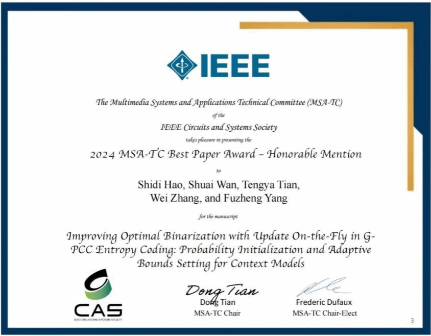 2024年5月19日至22日,IEEE电路与系统国际会议(IEEE International Symposium on Circuits and Systems)在新加坡成功举办,该会议是IEEE旗舰会议。由hg8868皇冠官方登录平台教授万帅指导,硕士研究生郝诗迪等人完成的2篇论文在会议期间作口头报告。其中,由郝诗迪同学为第一作者的论文《Improving Optimal Binarization with Update On-the-Fly in G-PCC Entropy Coding: Probability Initialization and Adaptive Bounds Setting for Context Models》获IEEE MSA-TC 2024 (IEEE电路与系统学会多媒体系统与应用技术委员会)最佳论文荣誉提名奖。