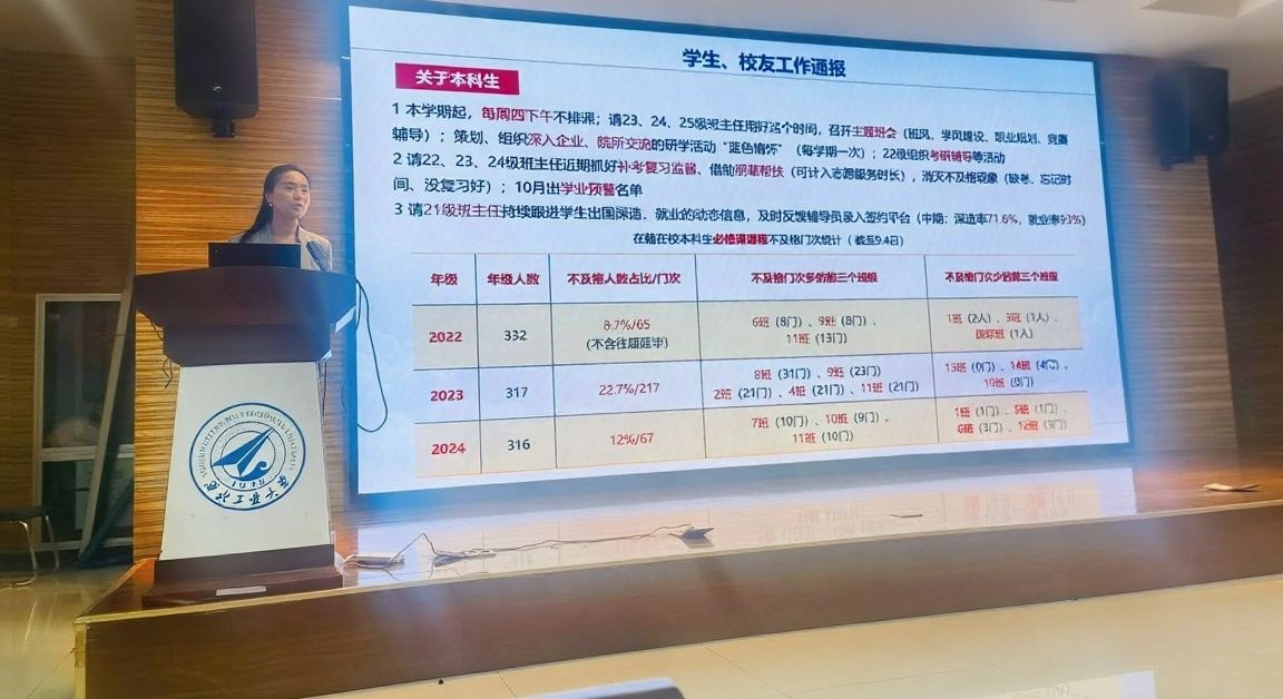 侯俊带领全体教职工深入学习了学校暑期务虚会和新学期干部会精神。他强调,此次会议明确了学校未来五年发展的行动纲领,全体教职工要全面贯彻会议精神,扎实落实学校战略部署,凝聚学院上下合力,将思想和行动统一到学校 “一十百千” 十五五目标上来。以“要上进、要努力、要奋斗”为指引,在工作中秉持敢拼敢闯的魄力与争先进位的追求,不断提升工作质效。