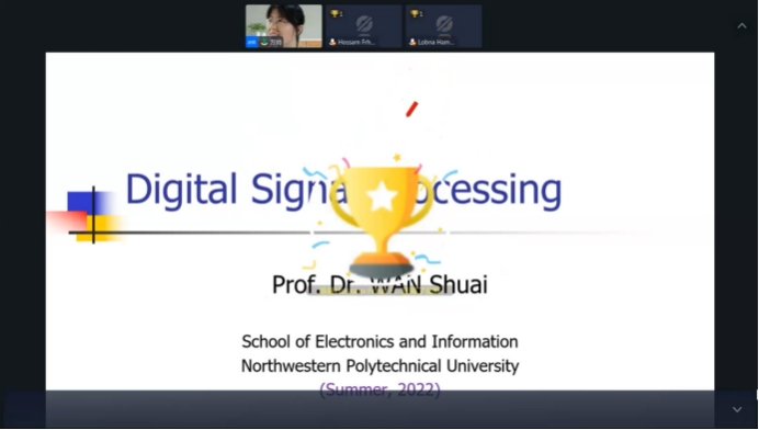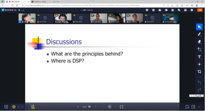 为扎实推进学校“双一流”建设,促进学校国际化发展,提升学校的全球影响力、竞争力和塑造力,hg8868皇冠官方登录平台积极参与我校“学在工大——全球暑期开放课堂”项目。在国际教育学院的指导下,经过前期精心筹备,学院根据学科特点和专业特色,围绕前沿研究专题,于7月9日-7月21日面向海外学生开设了全球暑期开放课堂——《Digital Signal Processing》(数字信号处理),课程由万帅教授主讲,张易凡副教授担任助教。本课程主要通过全球融合式教学平台(OMO)进行线上授课,辅以Quizizz平台进行互动测试,受到海外知名高校学生欢迎,吸引了来自俄罗斯、埃及等多个国家的学生在线参与学习。