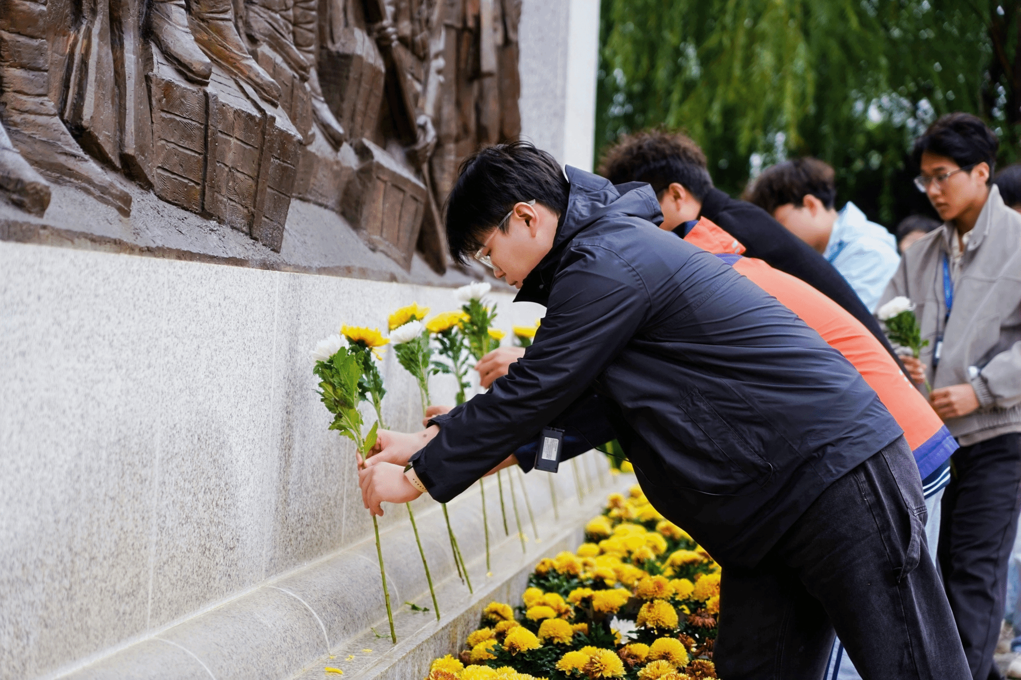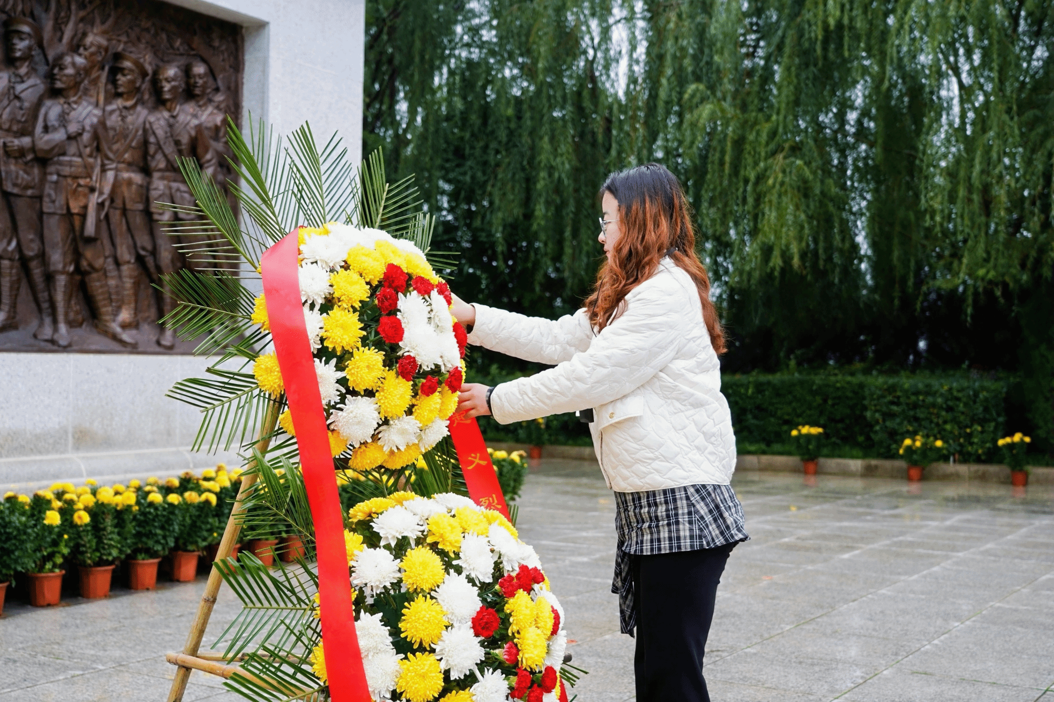 上午10时,在渭华起义烈士纪念碑前,敬献花篮仪式庄重举行。国歌响起,全体师生肃立。随着《我爱你中国》的旋律缓缓响起,师生手持菊花,绕碑缓行,静默瞻仰,追忆革命先辈的峥嵘岁月,并行鞠躬礼致以崇高敬意。
